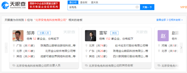 天眼查给出的信息显示,与“北京安兔兔科技有限公司”相关的老板主要有3位,邹涛、雷军和赵晨。雷军与安兔兔的关联,难免会引来网友质疑小米手机在安兔兔排行榜中的成绩。