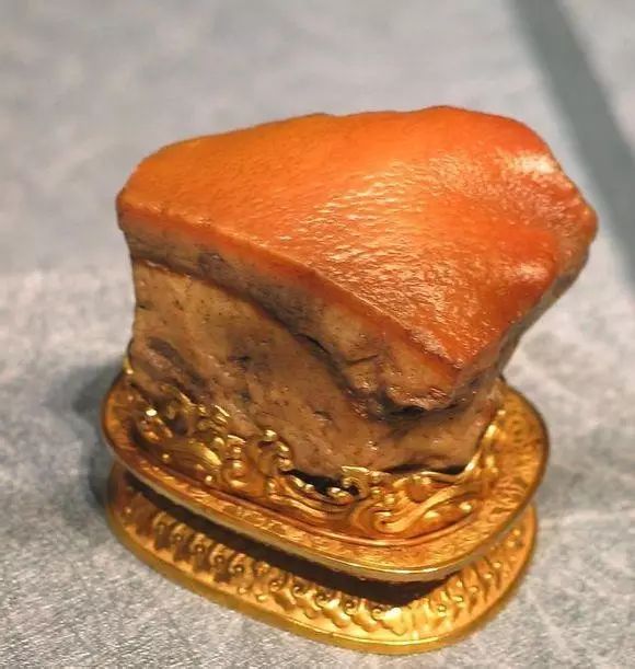 《东坡肉形石》,现收藏在台北故宫,如鸡蛋大小,其矿物化学成分是二氧化硅。此东坡肉形石,是一块天然的石头,色泽纹理全是天然形成,看上去完全是一块栩栩如生的五花肉块,“肉”的肥瘦层次分明、肌理清晰、毛孔宛然,肌理也相当逼真,现它与翠玉白菜、毛公鼎并称台北故宫的“镇馆三宝”。