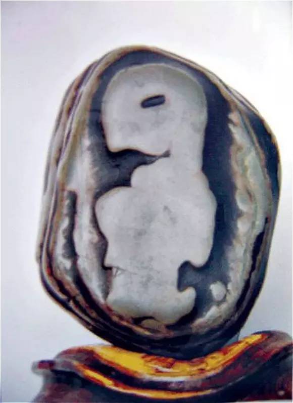 这块奇石高15厘米,宽13厘米血胆玛瑙,厚度为8厘米,石质细腻,通体四周是黑白相间的条纹框,框内画面是一个犹如静静蜷坐在母腹中熟睡的婴儿,眼睛已经发育,其它器官以及四肢尚不明显。这块奇石坚硬但表面非常光洁平滑,却完全出于天然,没有经过任何人工打磨抛光,而是长期被水流冲刷的结果。
