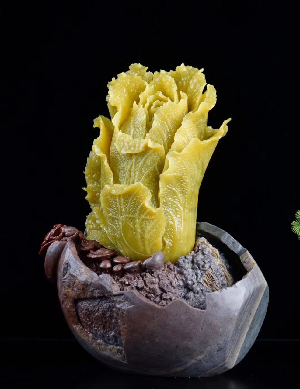 细看,这块戈壁石萝卜与真萝卜的相似度竟高达百分之九十以上,萝卜根、萝卜的纹,萝卜由绿到青的渐变色,细节之处处处到位。