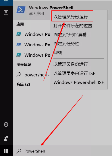 首先我们在任务栏中搜索PowerShell,然后以管理员身份运行搜索出来的“windows PowerShell”。
