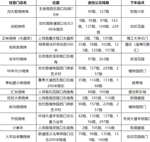 淄博市张店城区共42条常规公交线路可覆盖33家烧烤店,途经各烧烤店的常规公交线路明细如下: