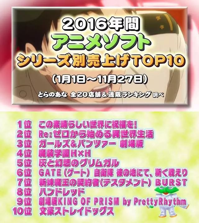 2017年冬季番马上就要来啦,不知道2016年你都看了哪些番呢?最近,日本TBS电视台播出的排行王国(ランク王国)节目公布了2016年的动画作品销量排行榜,在前10名的作品当中竟然就有3部卖肉动画,简直可以说是肉番的大胜利啊!