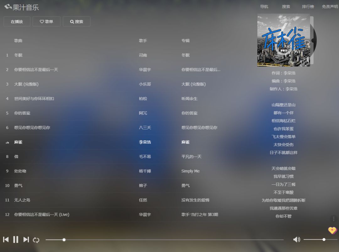 果汁导航旗下一款开源的基于网易云音乐api的在线音乐播放器。具有音乐搜索、播放、下载、歌词同步显示、个人音乐播放列表同步等功能。