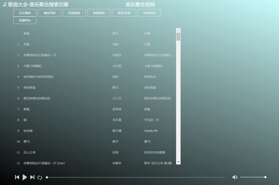 歌曲大全在线音乐播放器。具有音乐搜索、播放、下载、歌词同步显示、个人音乐播放列表同步等功能。