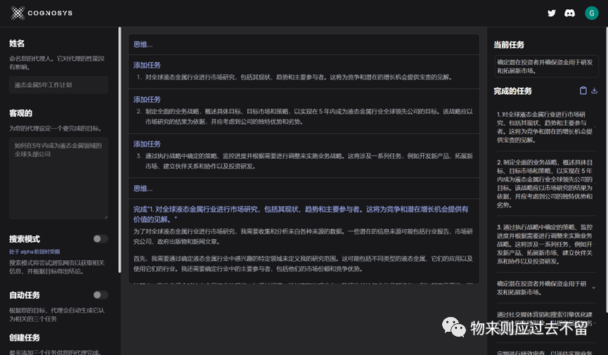 1. 使用Cognosys进行详细任务分析,这里使用Cognosys的目的是让GPT自动为目标生成任务,以及子任务,来头脑风暴自己的想法,提供一些可行的灵感。