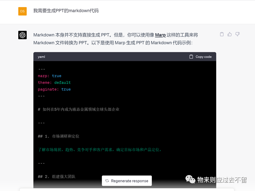 首先我们来分拆生成PPT的步骤。同样我们借助于ChatGPT来生成:ChatGPT生成的是相对标准完美的PPT制作标准,我们在实际的操作过程中,可能会几步并作一步来完成。
