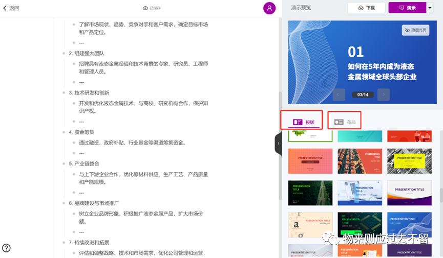 其中有固定模板可选,也可以选择相关布局,总体来说相对单调,生成相关PPT框架还是不错的,但是需要调的部分相对较多。