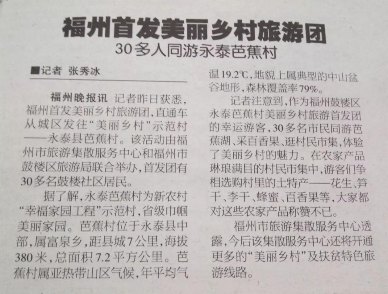 为了促进城乡融合、推进美丽乡村建设及旅游扶贫,9月16日,福州市美丽乡村旅游首发仪式在福州市旅游集散服务中心举行。该活动由福州市旅游集散服务中心和福州市鼓楼区旅游局联合举办,首发团30多位福州鼓楼区社区居民游览了“美丽乡村”示范村——永泰县芭蕉村。