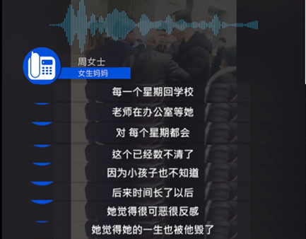 受害者的母亲说,女儿每周五回家,周日返校,而每个返校的下午,“老师都在办公室等着她”。