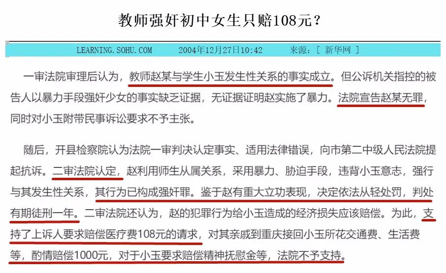 到最后,法院甚至还驳回了家属请求的抚慰金,只让强奸犯赔了女孩108块钱。