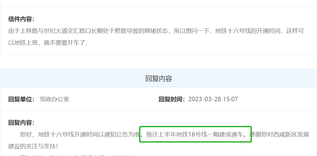3月28日,官方明确回复,预计上半年地铁16号线一期建成通车;