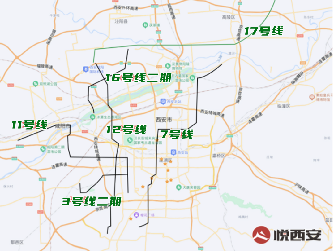 11号线则是从高新出发,然后西延,途径沣东、沣西,直达咸阳市区,12号线则是空港出发,向南延伸直达高新;16号线(二期)号线则是向北延伸;