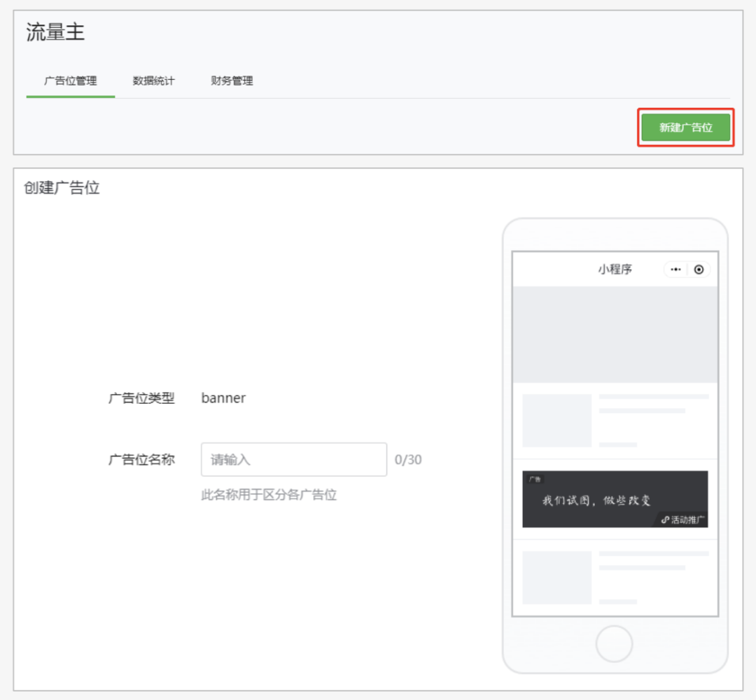 点击“新建广告位”,然后填写广告位名称;创建后,点击“获取代码”,然后复制代码。