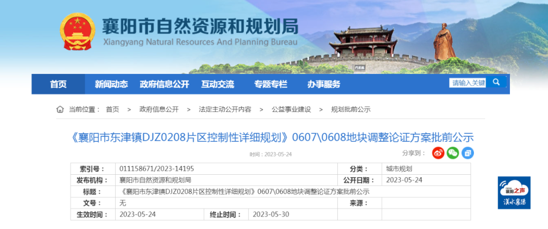 《襄阳市东津镇DJZ0208片区控制性详细规划》0607608地块调整论证方案批前公示