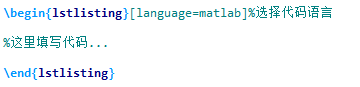 在中间的填入实际的代码内容,第一行和最后一行是代码环境,在排版过程中只需要把代码放进这个环境里就行了。另外实际美观的东西,有兴趣自己去了解了,比如说代码关键字的颜色之类的,不过这个无伤大雅,没有多大必要去设置这些,比较代码是放在论文附录里面的,只要你的代码能运行就可以了。