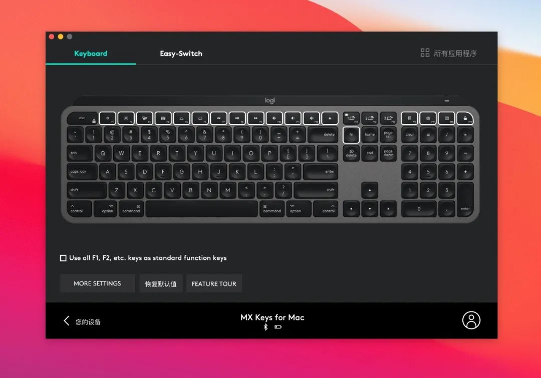 Logi Options 软件也可以添加 MX KEYS 键盘,这样就能在软件中查看键盘或鼠标的剩余电量、连接的设备、或者自定义 function 功能键。