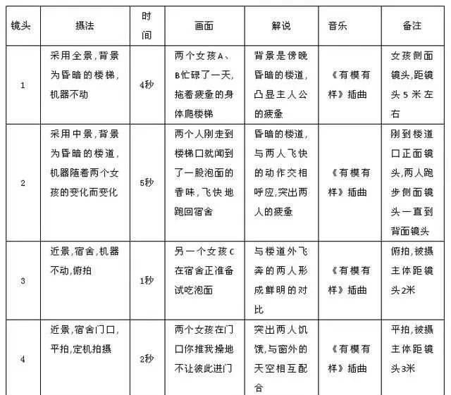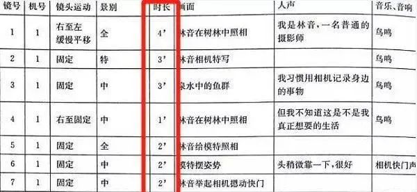 分镜头脚本通常采用表格的形式,一般按镜头号、镜头运动、景别、时间长度、画面内容、人声、音乐音响的顺序等做成表格,分别对应填写。