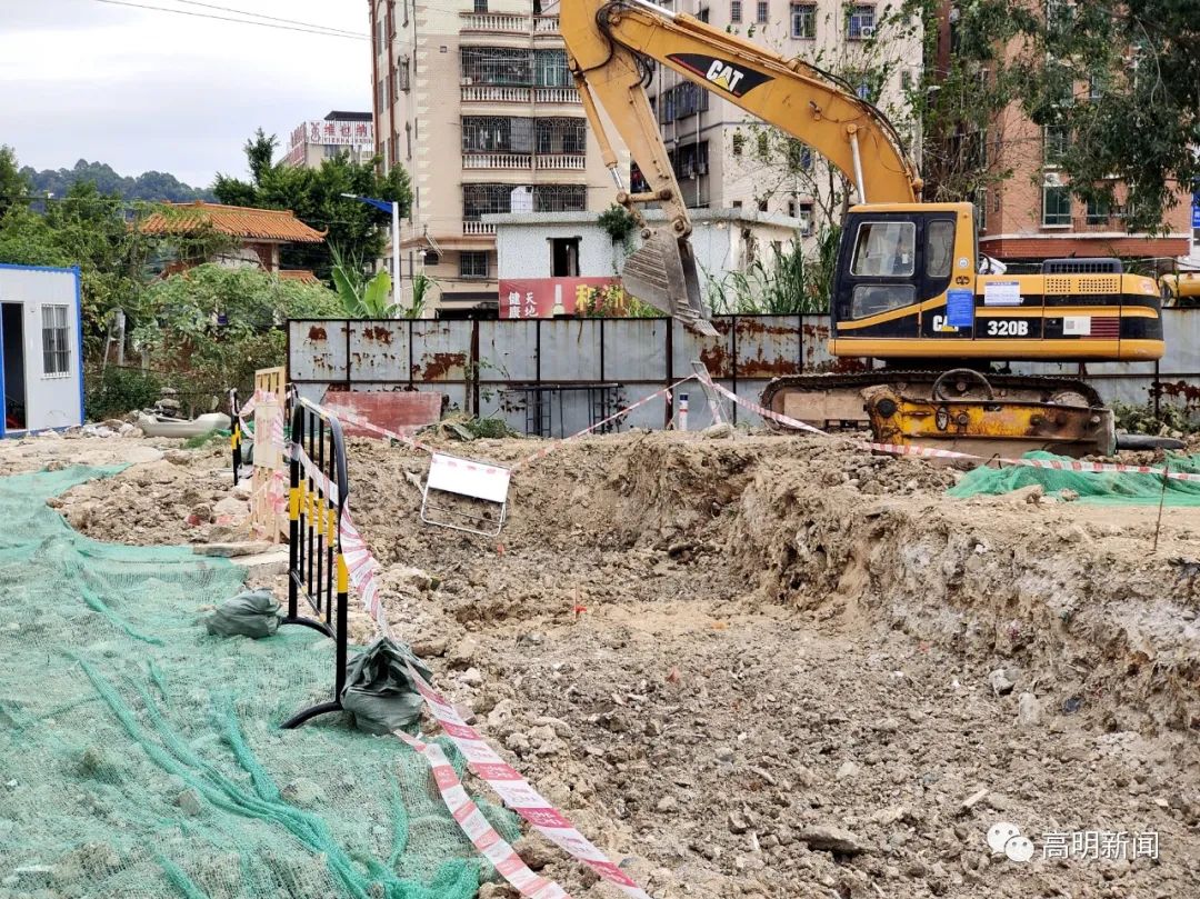 在荷城中学门前,工地四周已经围蔽,打桩机正在进行钢板桩施工,为接下来埋设污水管网作防护。