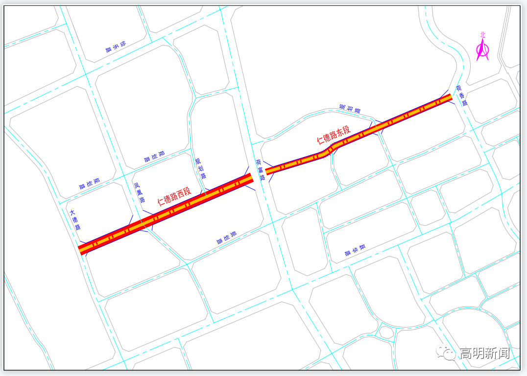 仁德路连接大德路和荷香路城市次干路,是一条新建道路,施工分两段进行,其中大德路至荷富路段为西段,荷富路至荷香路段为东段。目前动工建设的仁德路(东段)道路等级为城市次干路,起点在荷富路东侧辅路,自西向东,终点与现状荷香路相交,路线全长约 680m。路面宽度为30m,双向 4 车道。