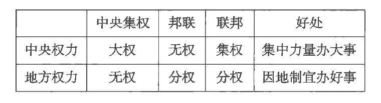 教学中的过度解读更是俯拾即是。有老师在讲到美国联邦政府的建立时,为说明中央权力与地方权力的区别和作用,选择了三段材料:《宋史·范祖传》“收乡长、镇将之权悉归于县,收县之权悉归于州,收州之权悉归于监司,收监司之权悉归于朝廷”;《联邦宪法修正案》第十条“宪法未授予合众国、也未禁止各州行使的权利由各州人民保留之”和托克维尔所言“(联邦制)为了把因国家之大而产生的好处和因国家之小而产生的好处结合起来”之后,整合出下表: