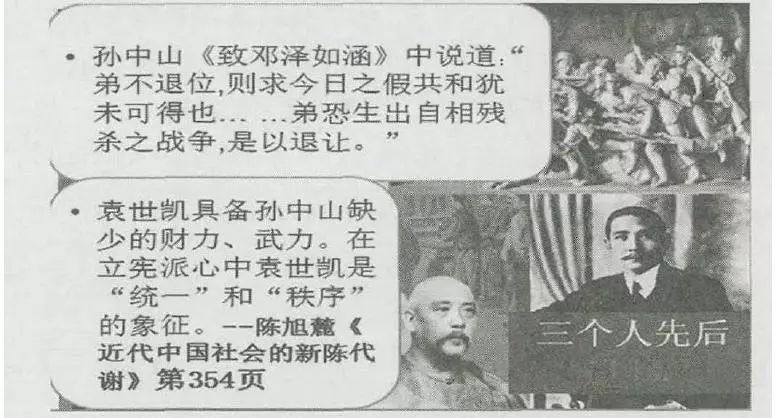 从课件截图可见:为了说明孙中山辞去临时大总统一事,李老师引用了当事人的信件和后世研究者研究成果完全不同的材料,同时材料的背景用到了浮雕、孙中山和袁世凯二人的肖像照片。这些都是异源互证。