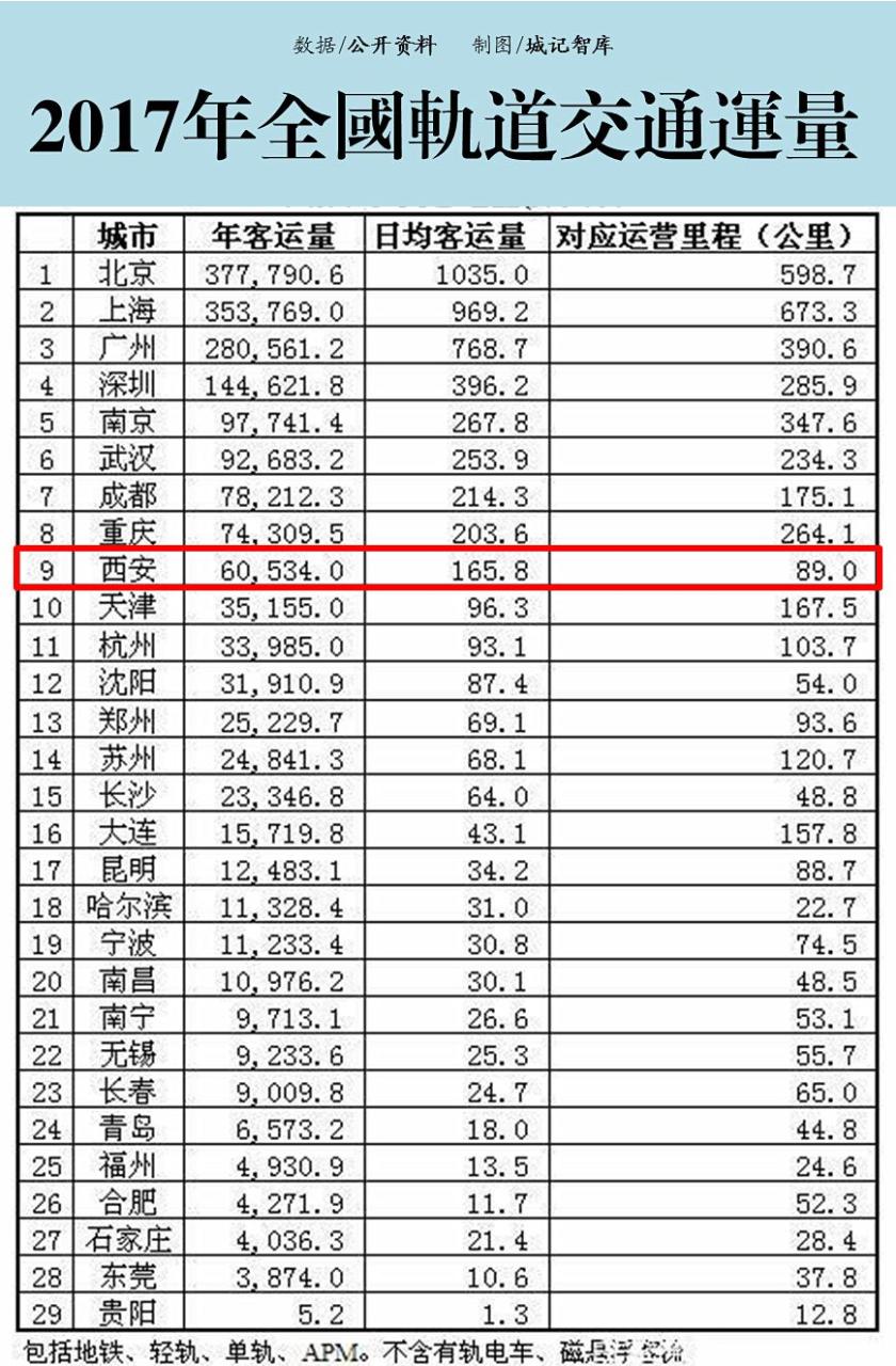 从全国排名来看,京沪穗深四大城市,客流量明显,突破十亿人次。客流量前十里,天津排名最后,其绝对数值比西安差距不小,可以说是腰斩。西安以89公里的地铁,运送了六亿人次的客流量。大连、苏州、杭州整体里程过百,但是客运量不尽如人意,未能进入前十。