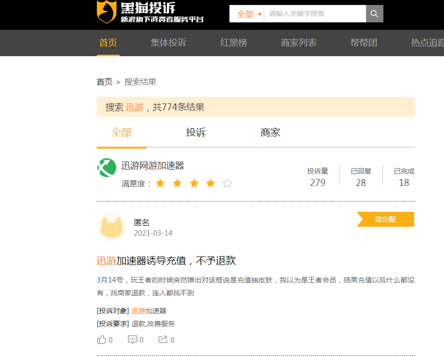 迅游科技除了股价表现不佳备受诟病外,其产品迅游加速器也投诉不断。记者在新浪黑猫投诉平台发现,涉及迅游加速器投诉有279单,投诉主要内容为加速无效果。