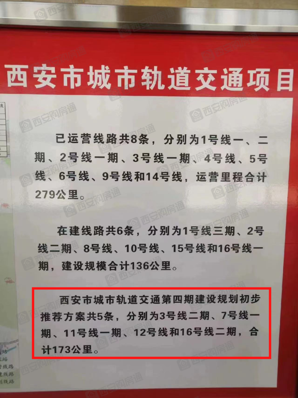 可以明显看出这张照片拍摄于一张公示展板,内容写道:西安市城市轨道交通第四期建设规划初步推荐方案共计5条,分别为3号线二期、7号线一期、11号线一期、12号线和16号线2期,合计173公里。