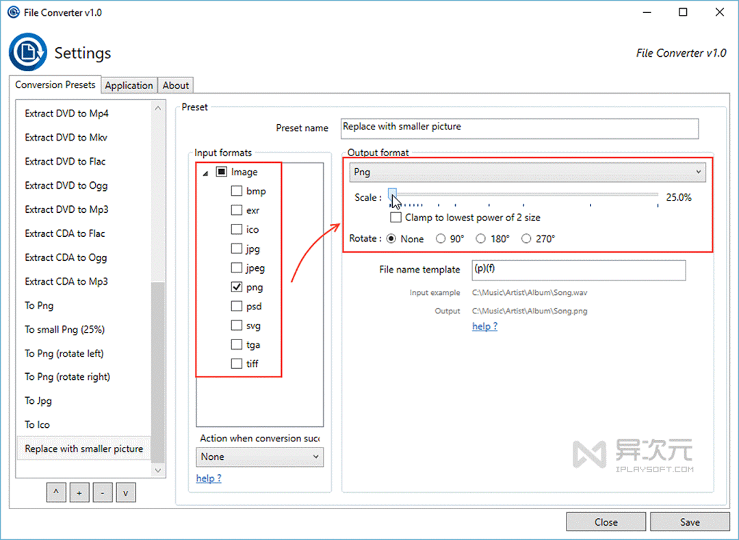 但你也可以针对某种格式制定自己的设置方案 (这里叫 Preset “预设”),比如你可以设置:图片转换成 PNG 格式时,将图片缩小放大、旋转角度、重命名、转换后删除原文件等等。如下图演示,保存了一个叫做“Replace with smaller picture”(替换成小尺寸图片) 的预设。