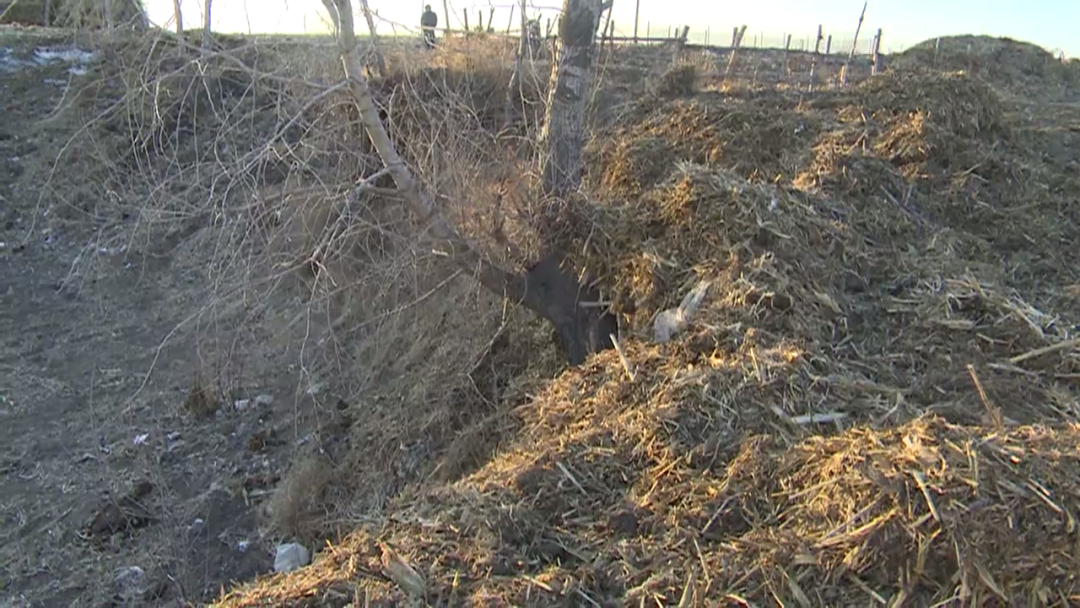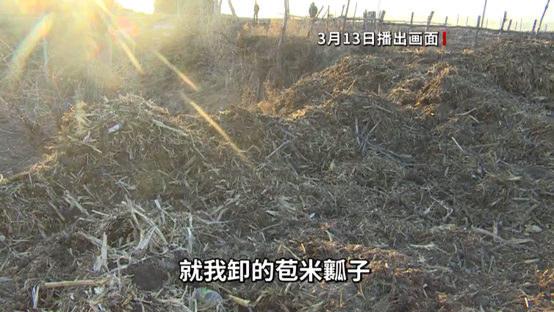 望奎县通江镇红头村永兴屯村民 王斌:全让我卸道边了,然后用铲车铲到坑里了山狸,找不着了,我卸的苞米瓤子都放那了,看不见了。