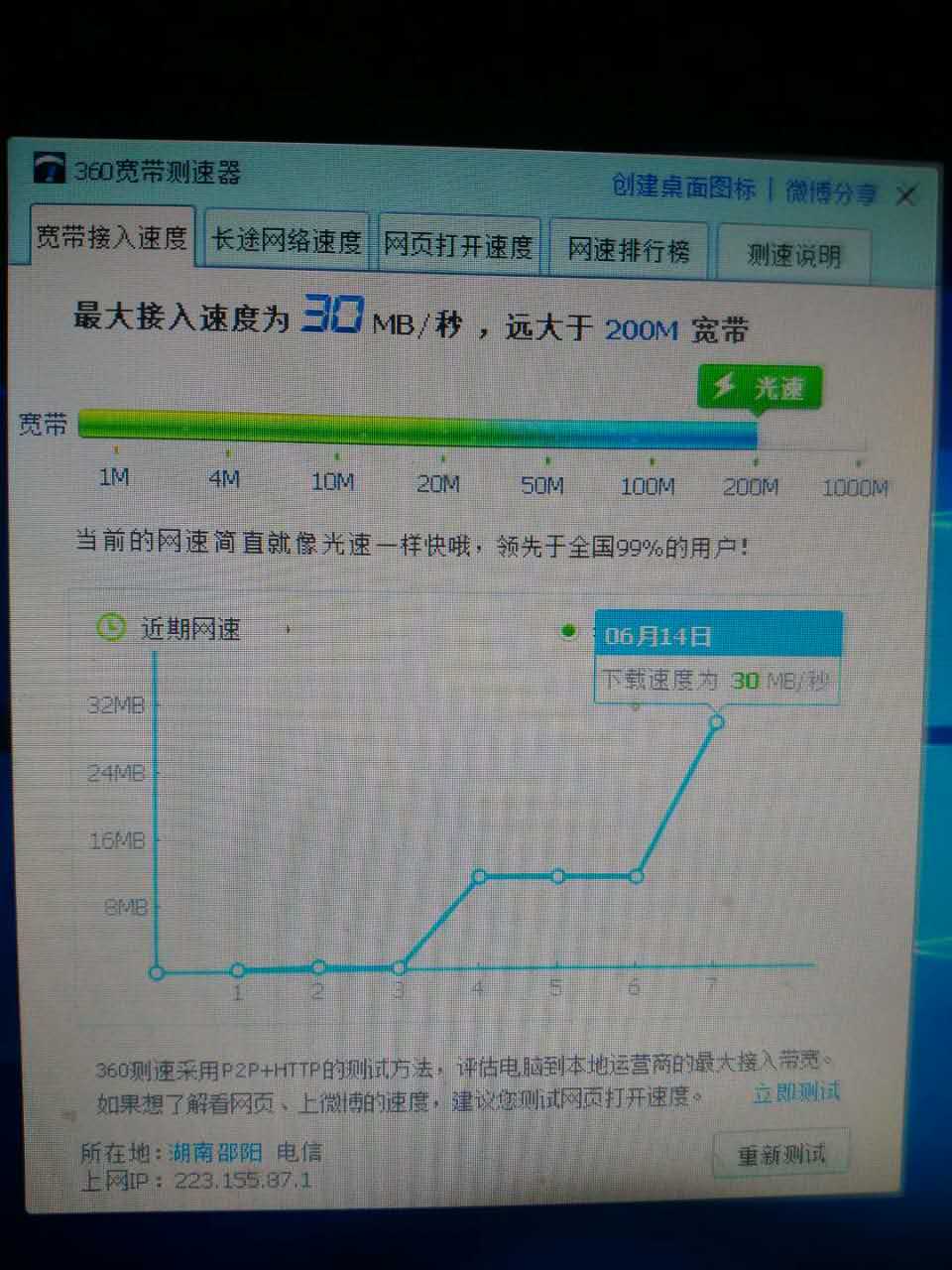 答:电信的测试网站和其他测速工具测试方法大致相同,都是通过对特定文件的下载速率来反映点到测速服务器中间的网络情况。但测速服务器在网络中部署位置不同,服务器能力以及服务器出口网络拥塞情况,都会造成测试结果的差异。因此,只要测速数值波动在一个合理范围内都属于真实情况。