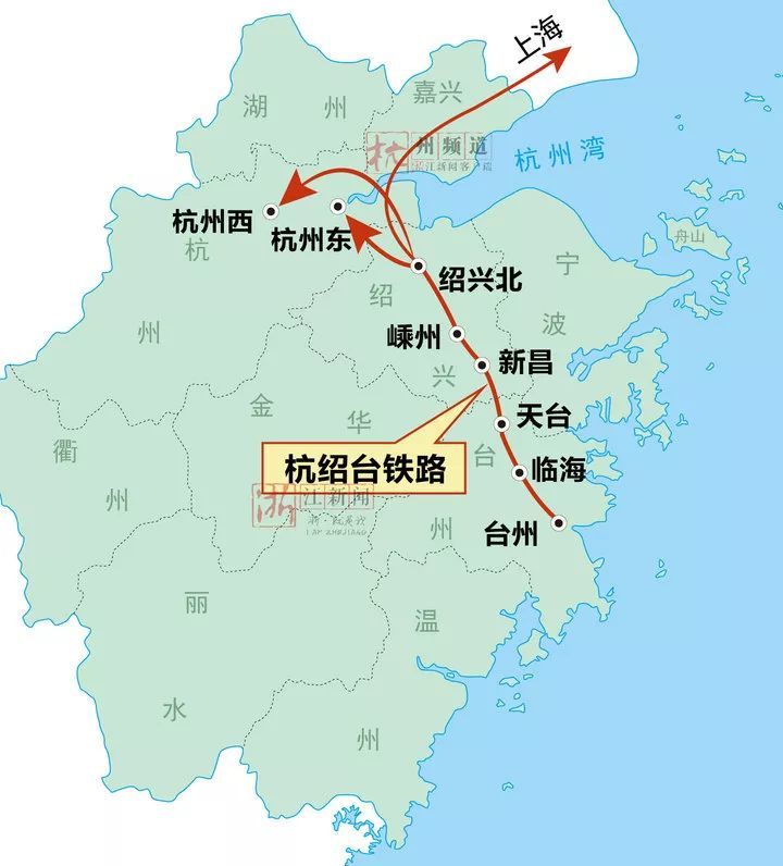 杭绍台高铁到杭州境内之后,分为三个走向:一是经杭州南站到达杭州东站;二是经江东通道接轨沪杭高铁复线(沪乍杭高铁)至上海虹桥(浦东);三是通过沪乍杭高铁联络线引入杭州西站。