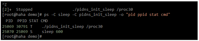 让我们回到运行pidns_init_sleep的shell会话。我们停止程序并使用ps命令在父命名空间的上下文中检查父进程和子进程的一些细节。