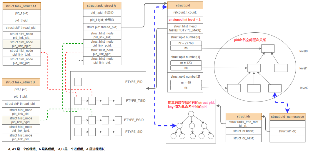 假设一个进程组中有A、B 两个进程,且进程组组长为A,进程A 是在 2 级命名空间中创建的,它的pid为45 ,映射到1级命名空间,分配给它的pid为123;然后它被映射到级别0 的命名空间,分配给它的 pid 是 27760。