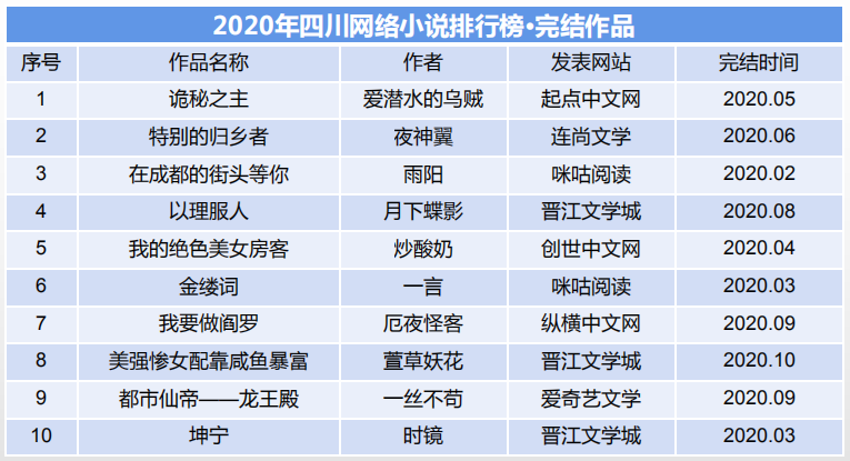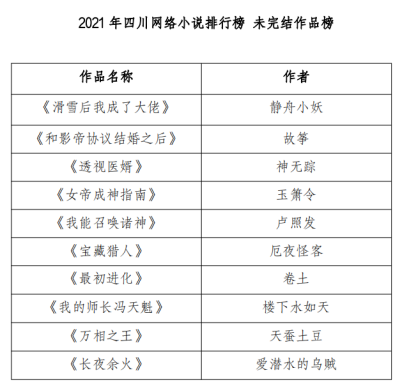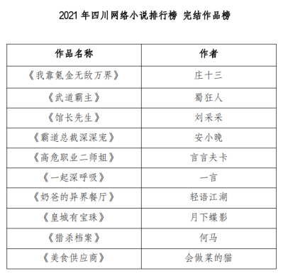 本次发布的2021年度四川网络小说排行榜,共含20部作品(含已完结及未完结作品)——既包含《长夜余火》《最初进化》《美食供应商》等一批来自网络川军中坚力量的精品力作,也不乏《女帝成神指南》《我能召唤诸神》等初出茅庐的新人新作。