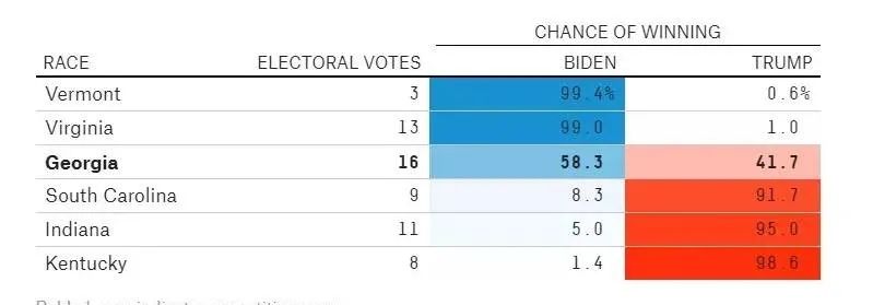 最早开票的是佛蒙特(3票)、维吉尼亚(13票)、乔治亚(16票)、南卡罗来纳(9票)、印第安纳(11票)、肯塔基州(8票)。深蓝、深红相信变化不大,唯一看点是乔治亚,拜登目前领先。