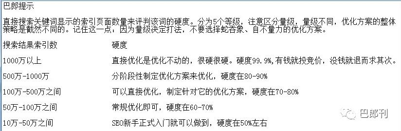 硬度:直接输入关键词搜索结果显示的数量,根据显示数量来制定总体的优化方案。硬度分为5个等级请牢记。