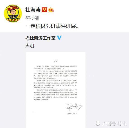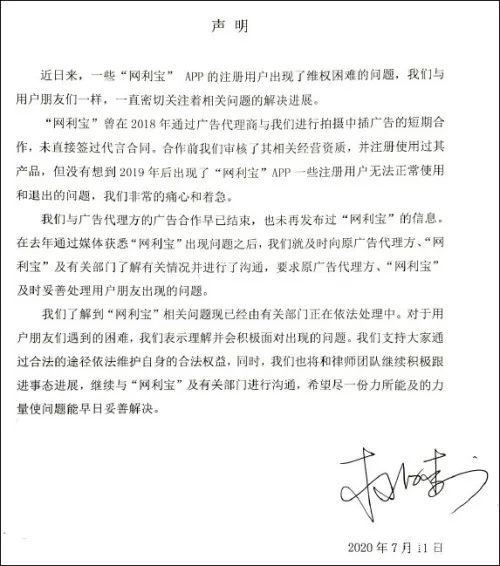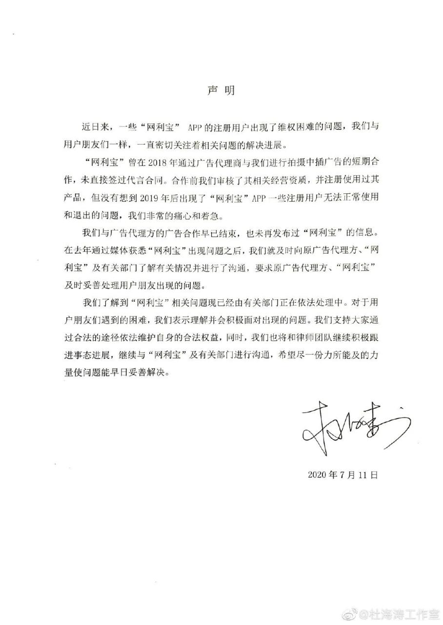 昨日(7月11日),杜海涛工作室发布声明称:仅在2018年与“网利宝”的广告代理商有过短期合作,未直接签过代言合同;2019年后,该APP出现注册用户无法正常使用和退出的问题,杜海涛方当时立即与对方沟通。