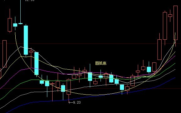 圆弧底一般发生在下跌末期,投资者想一想,经过长期下跌,市场需不需要一段时间调整!所以圆弧底的构筑周期比较长,但是股市大学可以明确告诉大家,圆弧底形成的时间越长,其可靠性越高,上涨幅度越大,因为这段时间主力吸收的筹码越多。圆弧底买点没有那么多,放量上涨的跳空缺口处为圆弧底的唯一可靠买点。注意不是最低点为买点