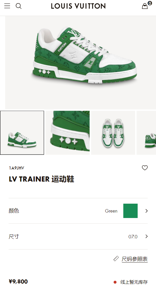 不过,目前比如Virgil Abloh的男装、秀场包款、球鞋等等都没有在这次的涨价范围。以最近爆款的LV Trainer白绿为例,中国区官方售价仍旧为9800元。