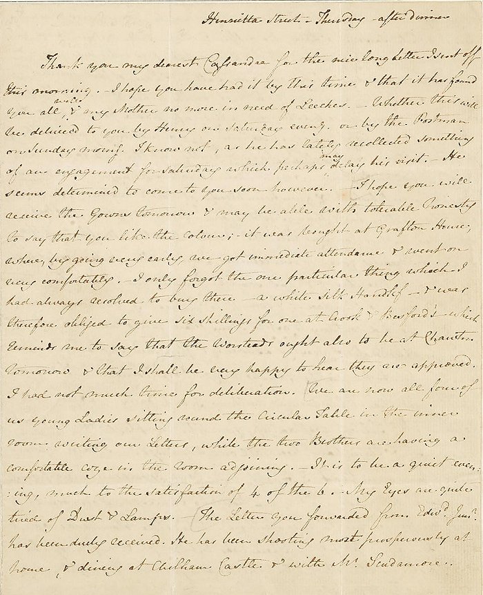 奥斯汀是懂得这种声音的,这是她在长期的通信中一直听到的声音。写信是孤独的,它虽然面向另一个人诉说,后者却并不在场;反过来,写信虽然孤独,却总有不在场的另一个人。奥斯汀的信大部分是写给亲人的,对她来说,这些信既私密又公开,这是一种在爱的共同体内部的分享。奥斯汀的家庭虽然贫穷,却并不缺少爱,亦不缺少丰富性和创造性,这已经足够为她提供不竭的生命能量。家庭中几乎一切的元素,都以各种形式进入奥斯汀的小说中,而她也最希望家人读到这些小说,后者就是她写给家人的另一种书信。亲人之间写信当然可以放肆一些,奥斯汀常说姐姐卡桑德拉的信让她乐不可支,写信人堪称当今时代最好的喜剧作家;而她自己在给姐姐的信中说到某位太太,就说后者“住在波利冈,我们回访时她出去了。这是她的两个优点。”这几乎是爱玛会用来嘲笑贫穷而傻气的贝茨小姐的话,但爱玛没有让这种刻薄真正伤害自己,奥斯汀当然也不会。在与亲人持续不断的通信中,她有足够多的机会成为更好的人,以更好地关怀每一个她所爱的人。当侄女范尼遭遇情感挫折时,极少恋爱经验的她给出的建议,是一个姑姑所能给出的最恳切、周全而又温暖的建议,仿佛她作为小说家的训练,只是在为此刻做准备。