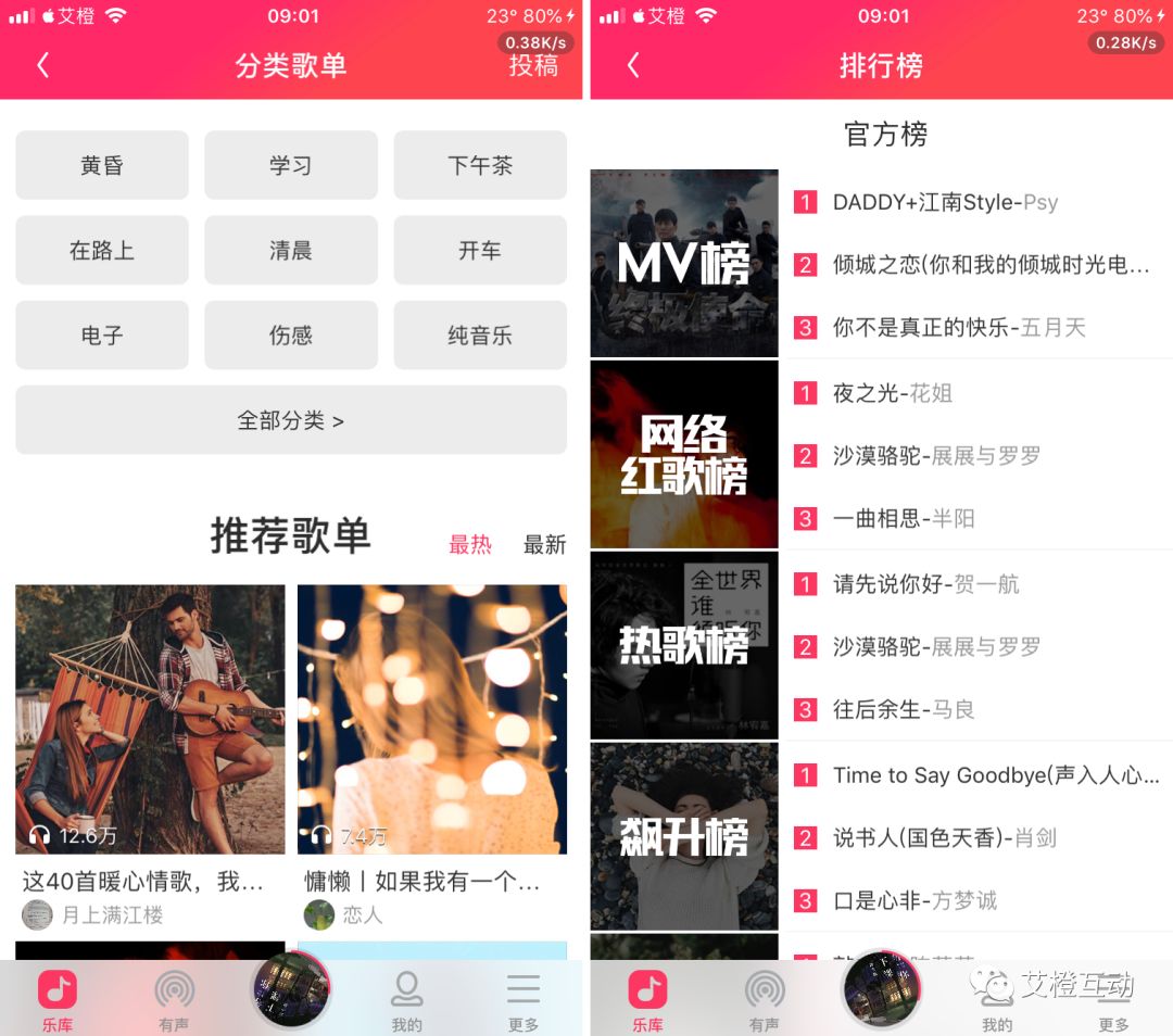 爱听4g音乐界面部分丰富,分为乐库、有声,正在播放、我的和更多板块。支持听歌识曲。