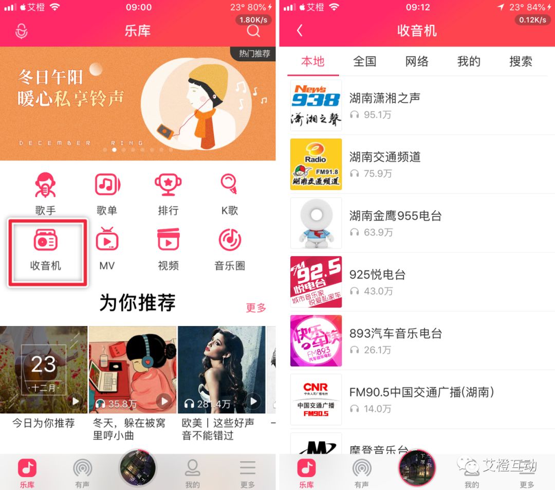 在乐库页面,可以看到收音机入口,爱听的收音机支持全国丰富的电台频道,你可以随时选择收听。开启允许定位后,可以收听本地电台。注:收音机需要网络支持。