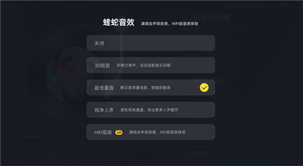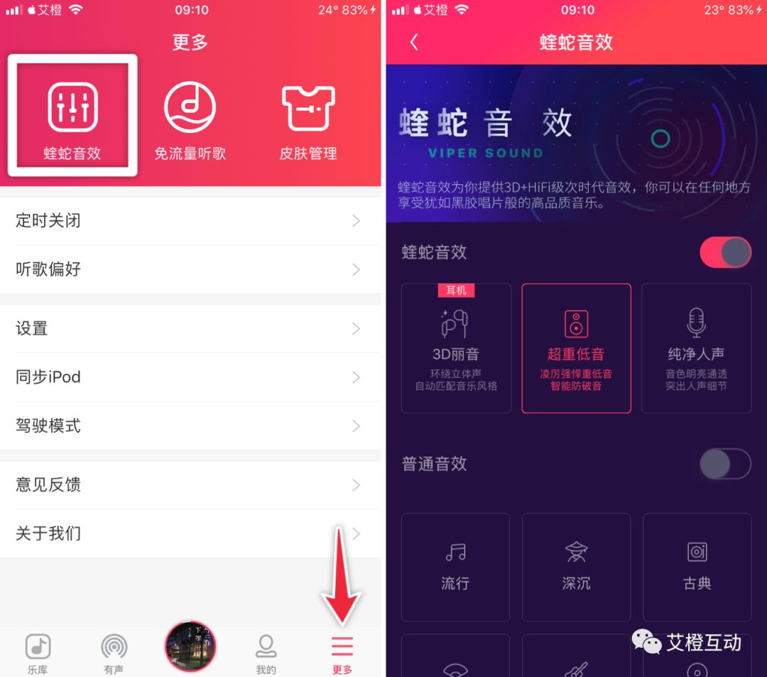 爱听音乐支持免费使用蝰蛇音效,在更多→蝰蛇音效中,可以根据歌曲不同,自定义效果。