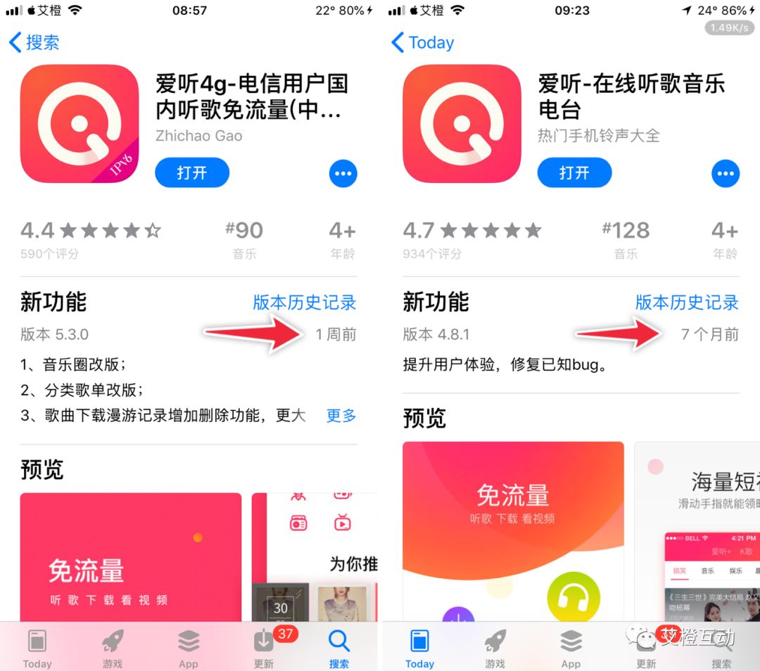 目前App Store 中有两个爱听 App,LOGO 是基本一样的。两个App 乐库相同,同样有启动广告,目前都可以使用。