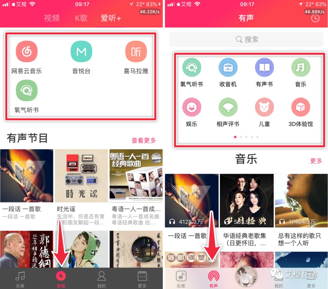 爱听的“发现”板块,包含视频、K歌和爱听+,在爱听+ 里面支持网易云、音悦台、喜马拉雅和氧气听书。