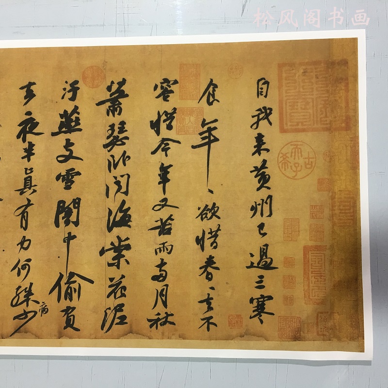苏轼早年学“二王”,中年以后学颜真卿、杨凝式,晚年又学李北海,又广泛涉猎晋唐其他书家,形成深厚朴茂的风格。他的书法,用笔多取侧势,结体扁平稍肥。这与他握笔的姿势也很有关系,苏轼执笔为“侧卧笔”,即毛笔侧卧于虎口之间,类似于现在握钢笔的姿势,故其字右斜,扁肥。
