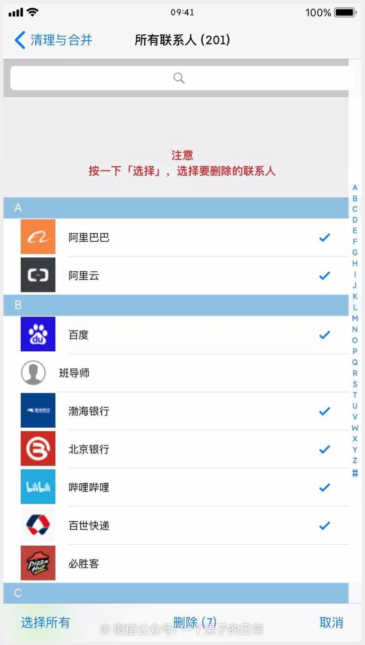 下载通讯录清理软件,具体下载链接已经放入后台回复之中(同上),进入首页菜单栏里的所有联系人,点击右下角选择并开始多选。