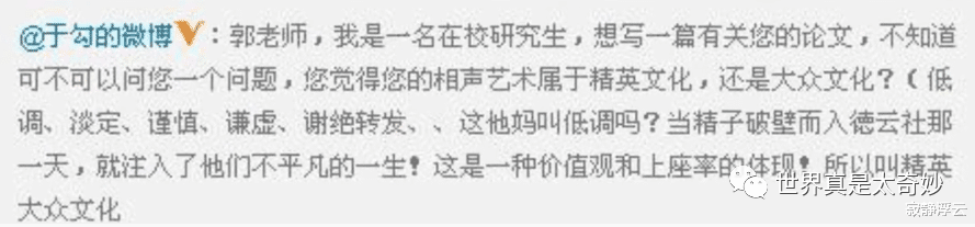 当时于勾曾发文表示“德云社注定不平凡,这是以一种价值观和上座率的体现,所以郭德纲的相声就属于精英文化”。于勾这话摆明了就是针对那些说郭德纲“三俗”的人说的,而于谦也对于勾的话十分认同,还特意评论他道:“二叔您的理论研究已经破壁而入了”。果然专业捧哏的就是不一样,一句话就说到点子上了。